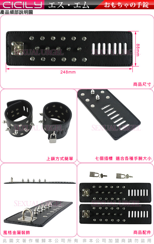 .商品內容:虐戀精品CICILY-調教奴隸-皮革鉚釘手腕銬(帶鎖)  X1