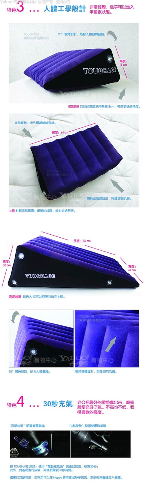 無論平躺、側臥、翹臀或俯首,「坡道愛墊組合」帶來的愉悅無以言表。 TOUGHAGE美妙的設計開放你的身體,喚起你的情慾,之所謂性愛無止境,獵奇心理和 探索創新精神將為你們帶來大滿足!