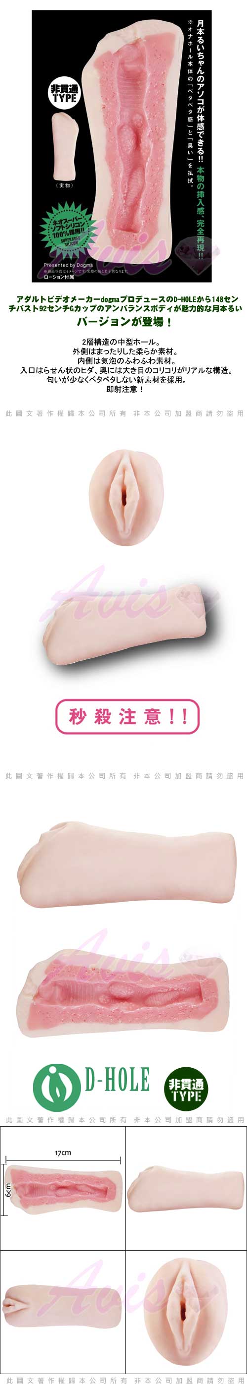 成人製片商dogma製造D-HOLE身高148胸圍92G罩杯的不平衡身材魅力十足月本瑞改造登場。雙層構造的中型自慰器。外側為豐富柔嫩的素材。內側為氣泡蓬鬆的素材。插入口皺折狀橫紋,深處為大顆粒橫隔的真實構造。採用沒什麼氣味不黏膩的新素材。即射注意!