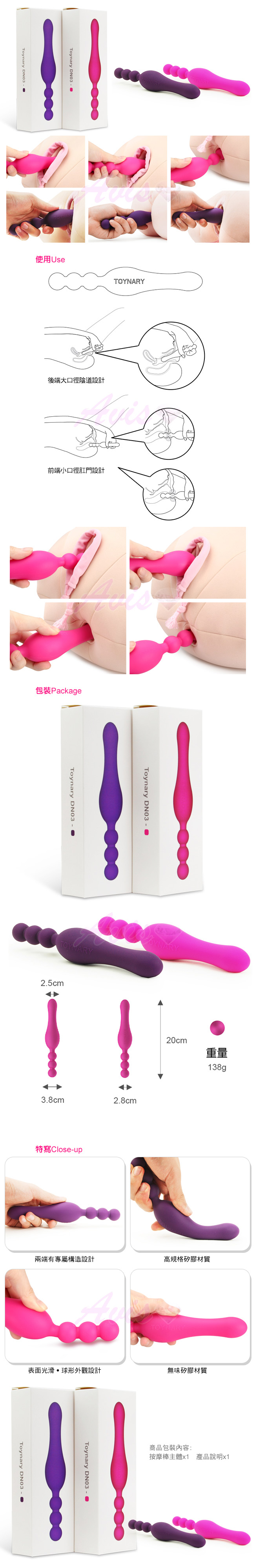 .主商品: 香港Toynary DN03 Cerise 雙頭設計 陰部/後庭兩用 拉珠按摩棒-桃  x1