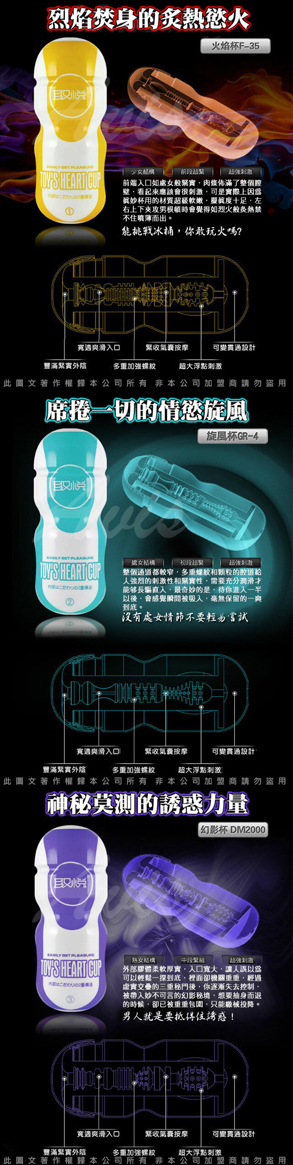 幻影杯-3:外部膠體柔軟厚實,入口寬大,讓人誤以為可以輕鬆一探到底,裡面卻機關重重,經過虛實交疊的三重秘門後,你已逐漸失去控制,被帶入妙不可言的幻影秘境,想要抽身而退的時候,卻已被重重包圍,只能繳械投降