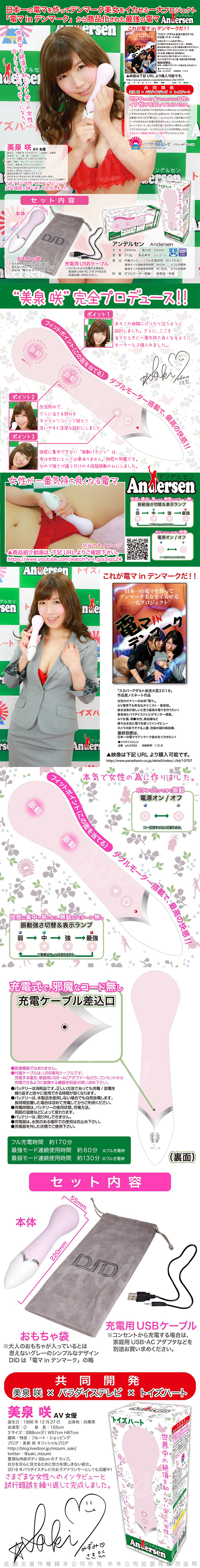 AV女演員美泉咲本次擔任日本成人電視台的女主播,與paradise電視台,以及對子哈特(toysheart)的員工共同精心打造的這款Andersen,是經過多重歷練,專為女性而設計出來的。