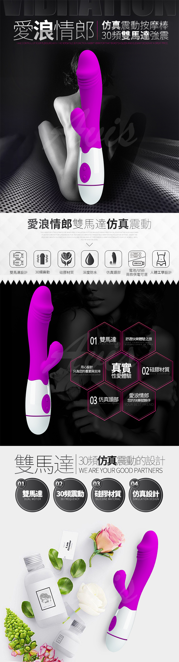 愛浪情郎 高端時尚30頻電動按摩棒 逼真款 USB充電版