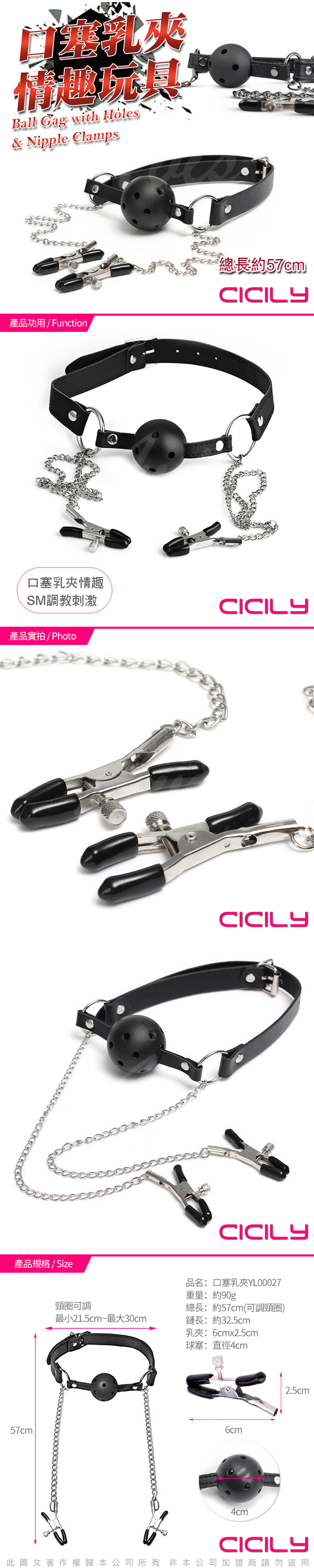 網眼口塞部分通過鐵鏈與乳夾連接,使用時將口塞球固定好並且夾上乳夾,隨著頭部的轉動,通過鐵鏈牽動乳夾,同時可對乳頭產生刺激!