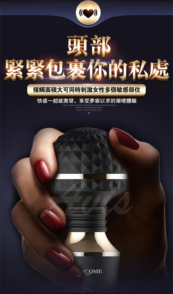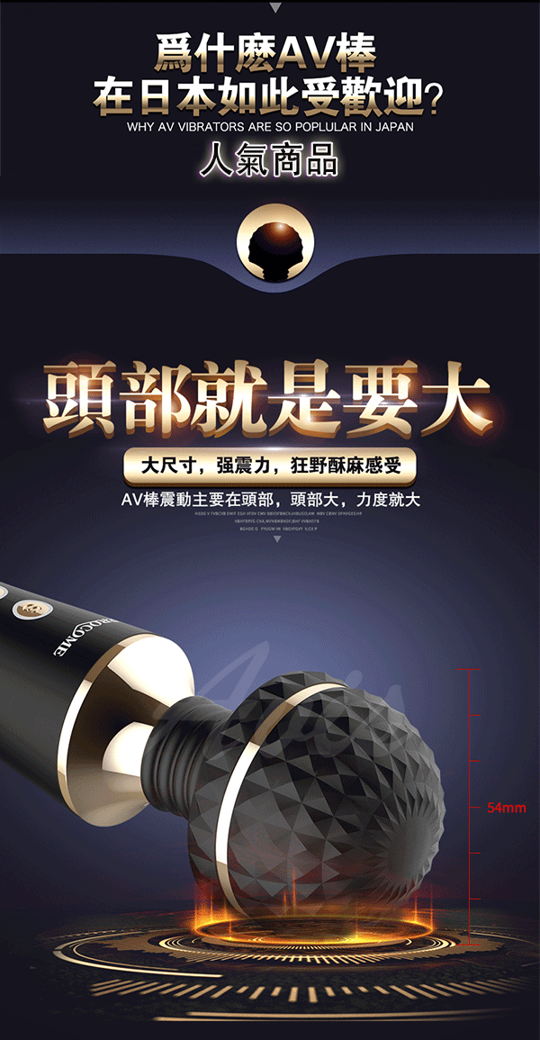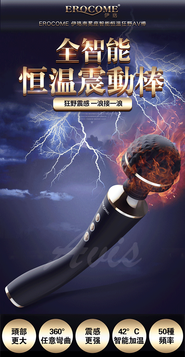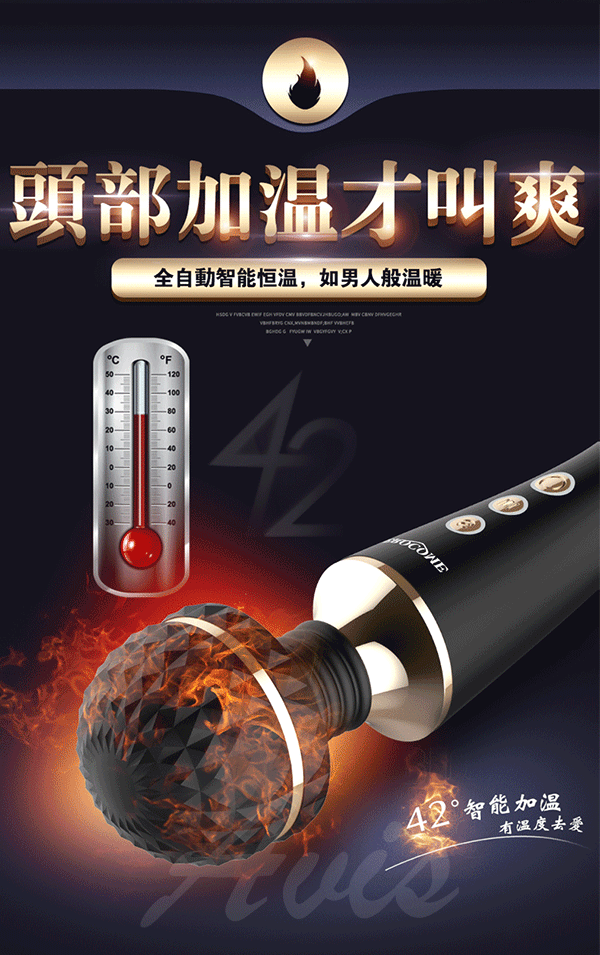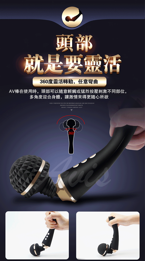全智能恆溫AV棒超大頭部,大尺寸,強震力,給您狂野酥麻感受。頭部可隨意輕觸或猛烈按壓刺激不同部位,360度靈活轉動任意彎曲,多角度迎合身體讓激情來的更隨心所欲。頭部擁有智能加溫給您如男人般暖暖的愛,還擁有10種震動模式及5種脈衝強度帶給您50種高潮體驗喔!採用柔軟親膚矽膠柔軟無異味,頭部的菱形凸點可增加刺激感~採USB充電快速便捷,讓您縱享激情時刻,還擁有防水靜音功能讓您盡情享受魚水之歡。
