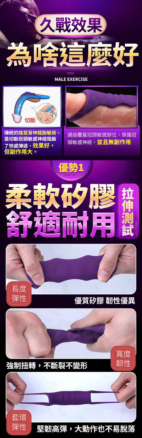 如意環設計保護冠狀溝敏感部位大大降低龜頭敏感度,莖體裸露不剝奪抽插時的摩擦快感,柔軟矽膠舒適耐用。可全身水洗讓您可以在沐浴時與伴侶自由享用,隨時滿足您的愛慾喔