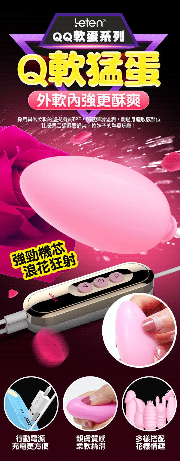 Q軟猛蛋採用異常柔軟擬膚質TPE,觸感彈滑溫潤,劃過身體敏感部位比暖男舌舔來舒爽,是軟妹子們的摯愛玩寵。採用的是高科技直充不需要等充滿電或換入電池才能使用,軟蛋不想讓您玩趣受線要您隨時、隨地、隨心快活行動電源隨身帶哪兒都是戰場喔