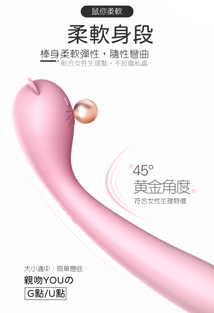 鼠於你的性福時光棒身柔軟彈性,隨性彎曲貼合女性生理點不拉傷私處,能有效刺激G點喔~採用USB充電隨處隨充,隨遇而安讓快感來的更快。8種高潮震顫深層穿透,頭不震動尾部插入,外不滿足蜜豆,內部衝擊G點蜜道。且靜音防水給您一個安穩的空間,盡情享受高潮