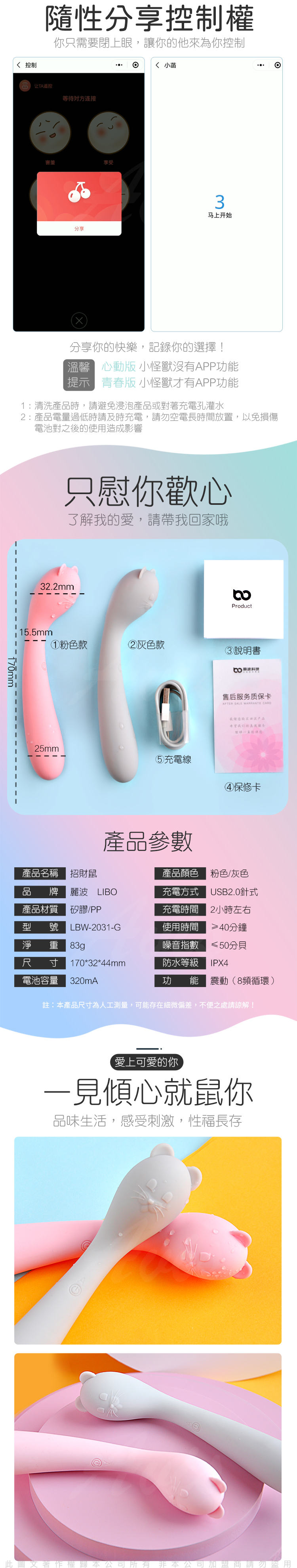 .商品名稱:LIBO-招財鼠 8段變頻防水柔軟G點按摩棒 智能版-粉色