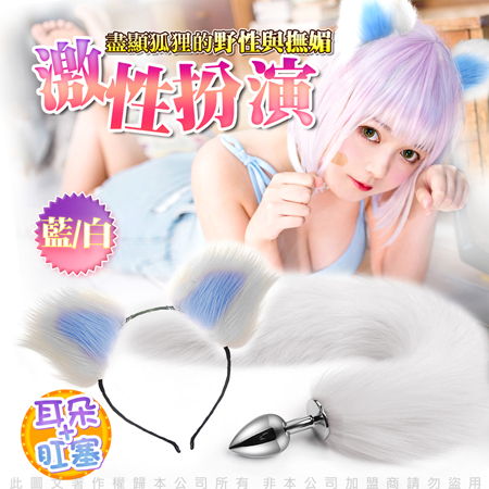 妖豔小狐狸角色扮演 毛絨耳朵+不鏽鋼肛塞尾巴 狐狸尾 白藍