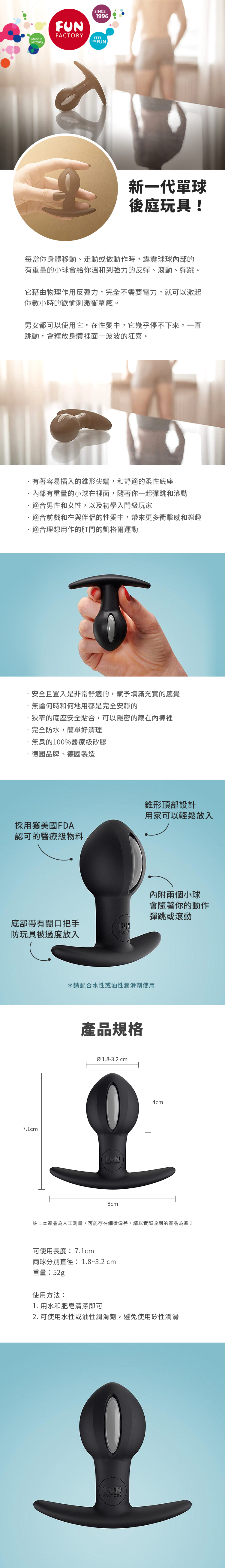 B球是市場上唯一能在性愛過程中直接對您或您伴侶的每個動作做出反應的一款後庭玩具。將B球插入體內合適位置時,此時,它就是一款典型的肛塞。但是與眾不同的是,它內含兩個靈活的小球,當您使用時,球體會隨著您的抽插無規則地撞擊,讓您體驗後庭刺激的快感,同時感受內部小球撞擊所帶來的陣陣熱浪,盡情享受這無與倫比的樂趣吧!