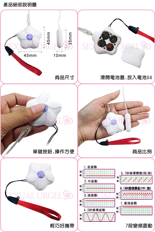 7段變頻的跳動模式,給你不同的刺激快感,超迷你的跳蛋不錯過任何一個敏感帶,獨特的櫻花型設計提高了性愛的樂趣,可隨身攜帶超隱密、超震撼的跳蛋,讓你享受愛液湧現的快感。