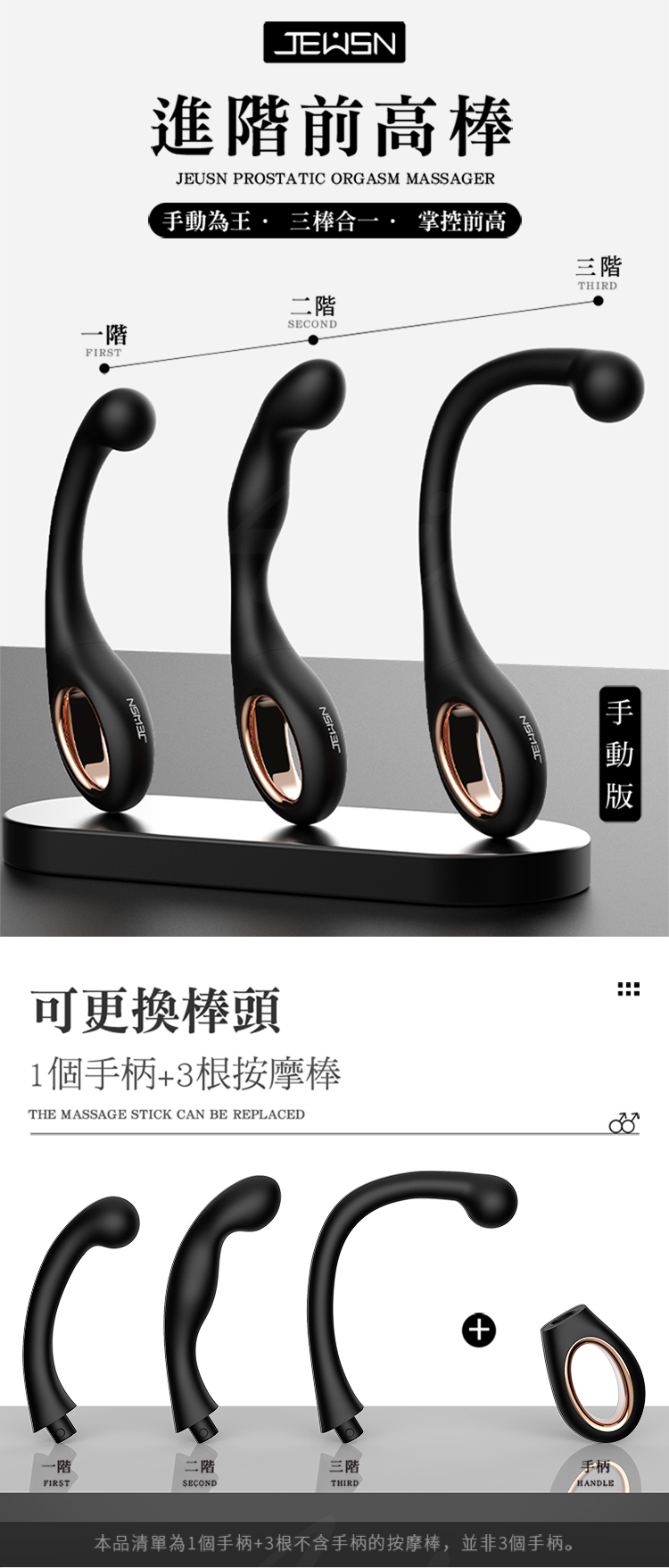 本品清單為1個手柄+3根不含手柄的按摩棒,並非3個手柄。