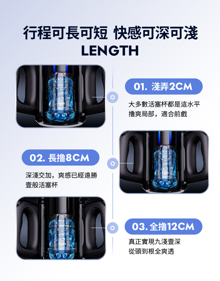 伸縮超長行程:2 - 12 cm 超長活塞行程可長可短,快感可深可淺,從頭到尾吞吐肉棒。