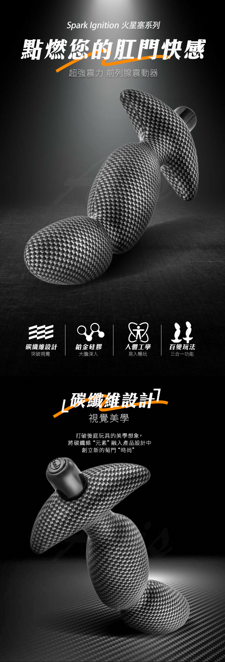 七人體工學:挑戰極限,讓您探索更深入的刺激體驗。頭部以錐形入體,尾部設有穩固的底座,並具有多段彎曲的造型,讓您深入後庭內壁,探索更刺激的感受,實現您的 '無射' 體驗。特別設計的頭部貼合 P 點,順滑進入體內,多段彎曲提供持久的摩擦,而圓潤飽滿的設計更加倍刺激。底座的設計旨在防止器具過深入體內,並具有防滑功能,確保使用的安全可靠。