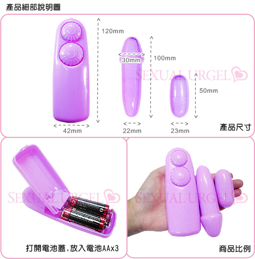 雙蛋設計可同時攻擊你最敏感的部位,龜頭型的跳蛋,給你最真實的滿足感,獨立式微調開關給可分別控制跳蛋的震動模式,光滑的觸感給你最深入的挑逗。